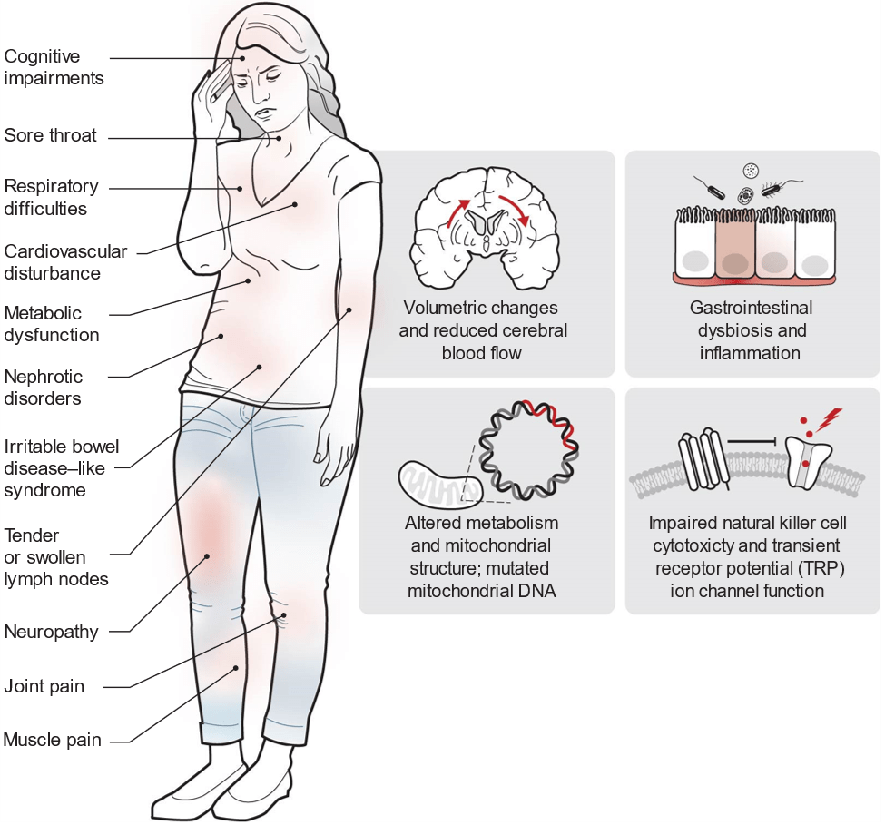 Postexertional malaise (PEM) is characterized by severe fatigue that occurs after mental or physical stressors. This is a strong characteristic of this syndrome. Unlike fibromyalgia in which increasing exercise and movement helps decrease symptoms, those with ME/CFS usually have worsening symptoms and are often followed by an episode of “crashing” which may lead to being bed bound for a day or more. There is some thought that there is an association with developing ME/CFS after previous history of infectious diseases including Lyme’s disease, infectious mononucleosis “mono”, and more recently long COVID.